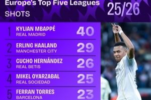 五大联赛球员本赛季射门次数榜:姆巴佩40次第一,哈兰德29次第二